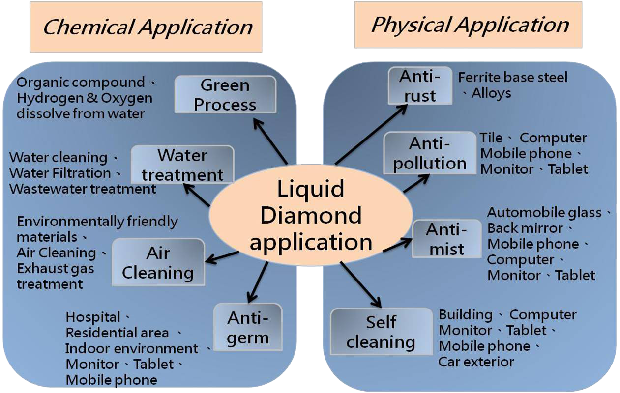 The Liquid Diamond irritated by UV light will produce ( OH-) ion which effectively destroy membrane of germs, solidities virus and decomposed the germ into CO2、 H2O etc, the ability of anti-bacteria up to 99.99 %. And can decompose the odor.